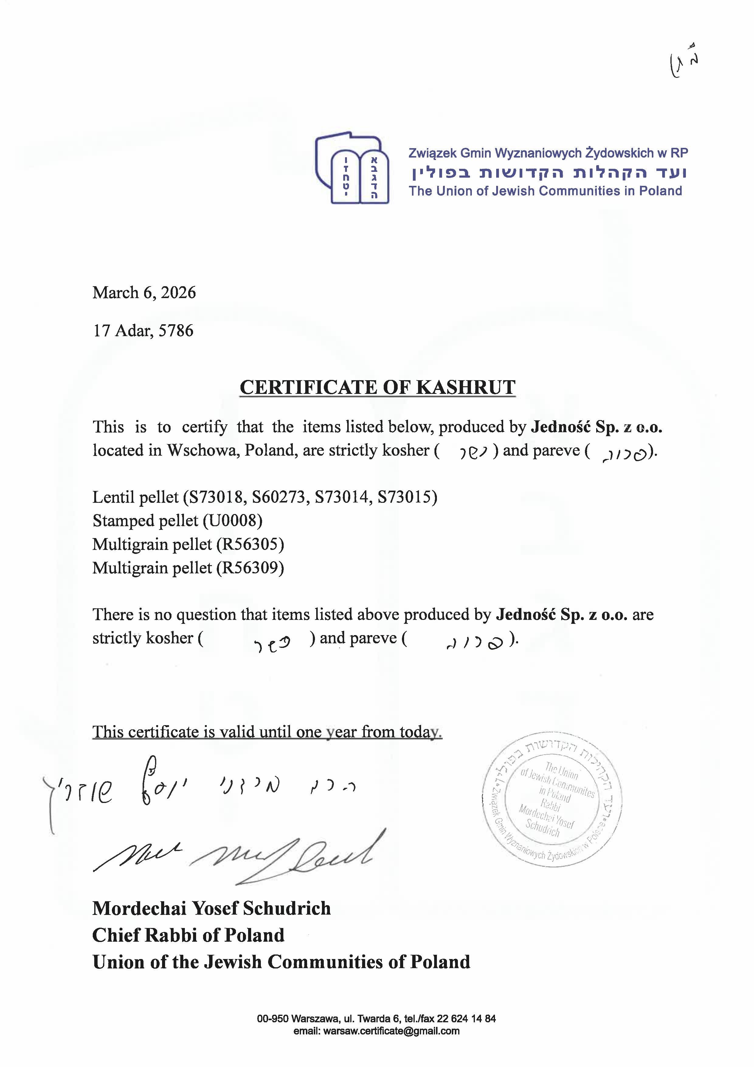 We certify for our client`s specific requirements, we have Halal and Kosher certificates for selected products.